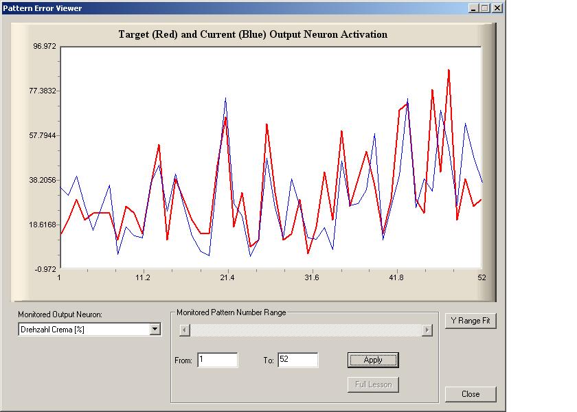 Ich schlag mich z.B. mit der Vorhersage des DAX (Deutscher Aktien Index) herum, und muß Dir sagen, daß meine Ergebnisse mit z.Z. 43 Trainings-Datensätzen schon wesentlich besser aussehen als bei Dir mit über 400 Datensätze.