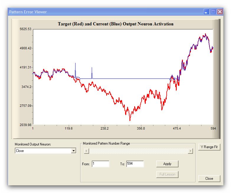 Da ich den "Close", also den Tagesschlusskurs des folgenden Tages anhand der eingegebenen Inputs (Open;High;Low;Close) des aktuellen Tages erhalten möchte, wähle ich den "Output" ab. Im Pattern Error Viewer lässt sich die blaue und rote Kurve der Validierungs-Datei betrachten... und eine horizontale Target-Linie die nach Eingabe der Inputs gen Null tendiert.