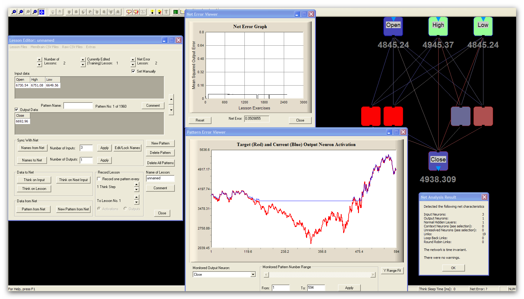 Ich konnte in der Zwischenzeit einen kleinen Einblick in diverse andere KNN-Softwarepakete gewinnen und muss sagen dass ich teilweise entnervende Erfahrungen mit der Bedienung machen durfte. Gerade weil ich kein Programmierer bin, muss ich viel Wert auf eine intuitive Benutzeroberfläche legen. Und obwohl es dort teilweise Prognose-Buttons u.ä. gibt, erschien es mir dennoch nicht wert auf die enorme Flexibilität zu verzichten die MemBrain bietet.