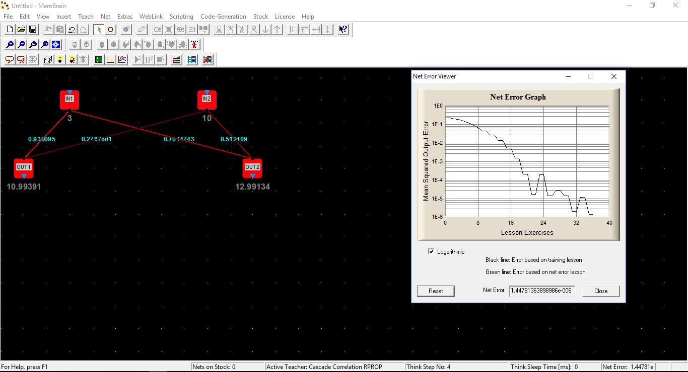 - Beim Anwenden dieser Lernmethode,stoppt die Fehlerminimierung sehr schnell und dabei kommt die Meldung "The target net error has been reached". Die implementierten Hidden-Neuronen werden nicht gezeigt oder werden diese im Hintergrund von Membrain berechnet?