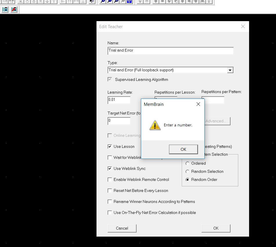 ich hab nun schon ein paar Wochen membrain ausprobiert, und finde die Software wirklich klasse. Jedoch hab ich ein großes Problem, nämlich kann ich keinen anderen Learning-Algorithmus als Teacher verwenden, als RPROP. Sobald ich nämlich einen anderen auswähle (egal welchen) und mit ok bestätigen will kommt ein Popup mit: "Please enter a number". Wenn ich das weggeklickt habe stürzt das Programm beim nächsten Klick ab, außer ich wähle wieder RPROP aus... Ist ein solches Problem vielleicht schon einmal aufgetaucht? Oder mache ich etwas grundsätzlich falsch? Eine Neuinstallation hat leider keine Verbesserung gebracht...